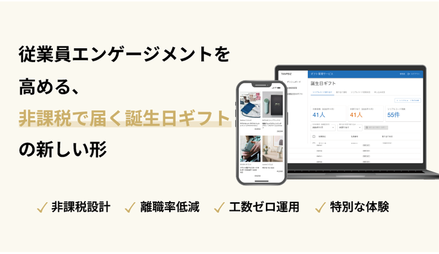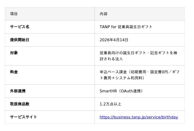 ギフト専門EC「TANP(タンプ)」を運営する株式会社タンプ(本社:東京都)は、法人向けギフトサービス「TANP for Business」の新プロダクトとして、「TANP for 従業員誕生日ギフト」を2026年4月9日に正式リリースしました。