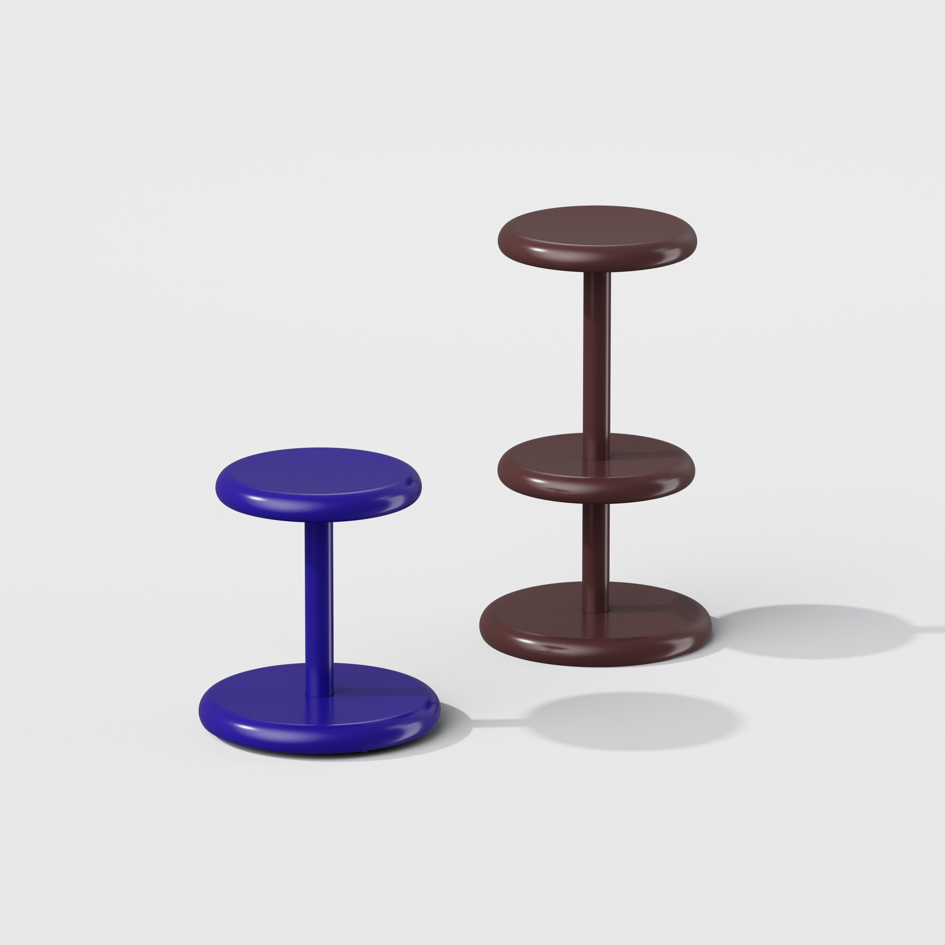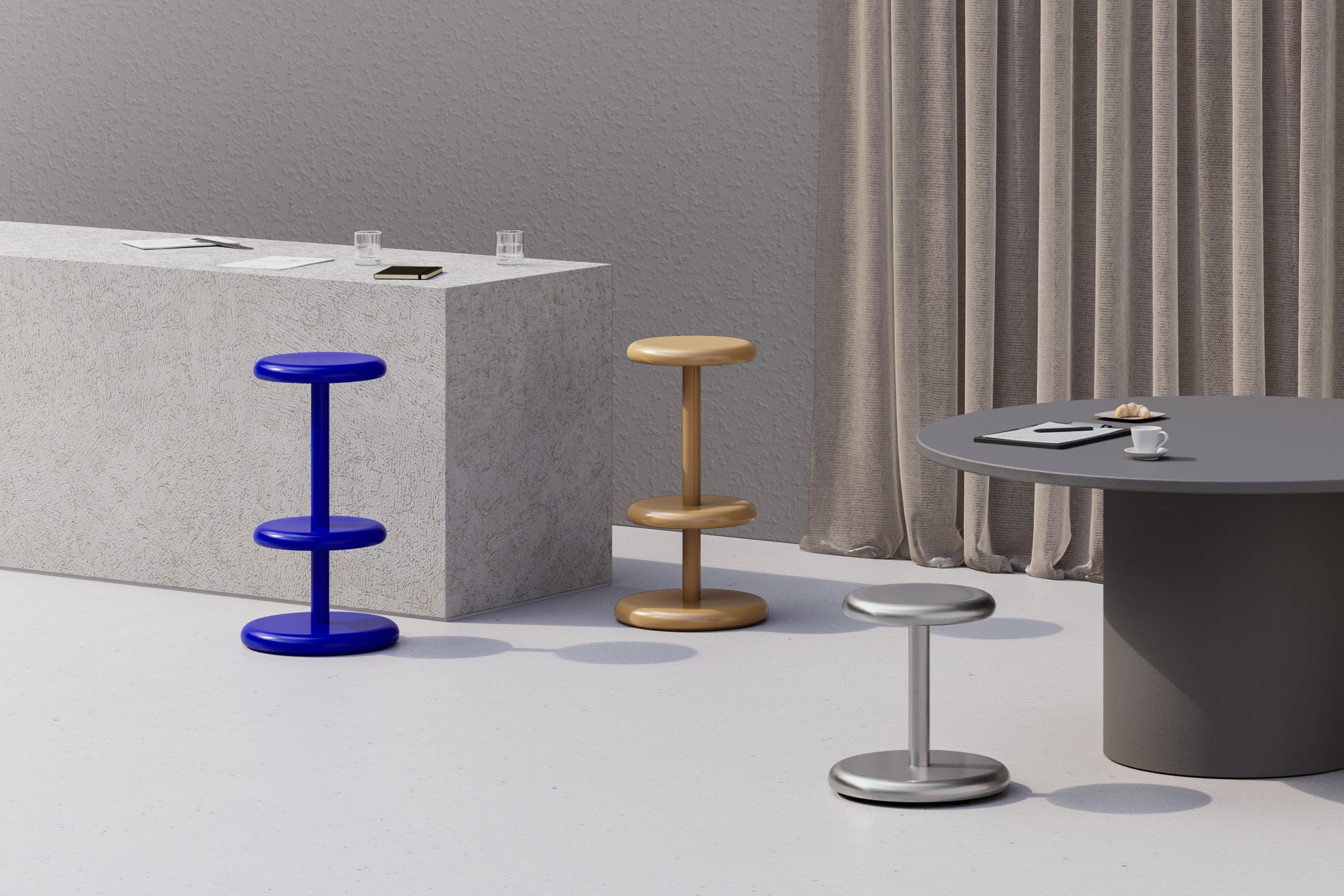 堅牢な金属製でありながら多彩な色と仕上げで展開するカラーバリエーションは、大きな丸みのある形状と相まって、どこか溶けるような柔らかな印象を与えます。 また、エッジを取った形状による視覚的なやさしさに加え、フラットパック可能な梱包も、人と環境の双方に配慮したデザインです。 座面と同形状の脚置きを備えたハイスツールも展開し、同様にミニマルな回転体として、空間や建築に自然に馴染み、長く愛用される存在を目指しています。