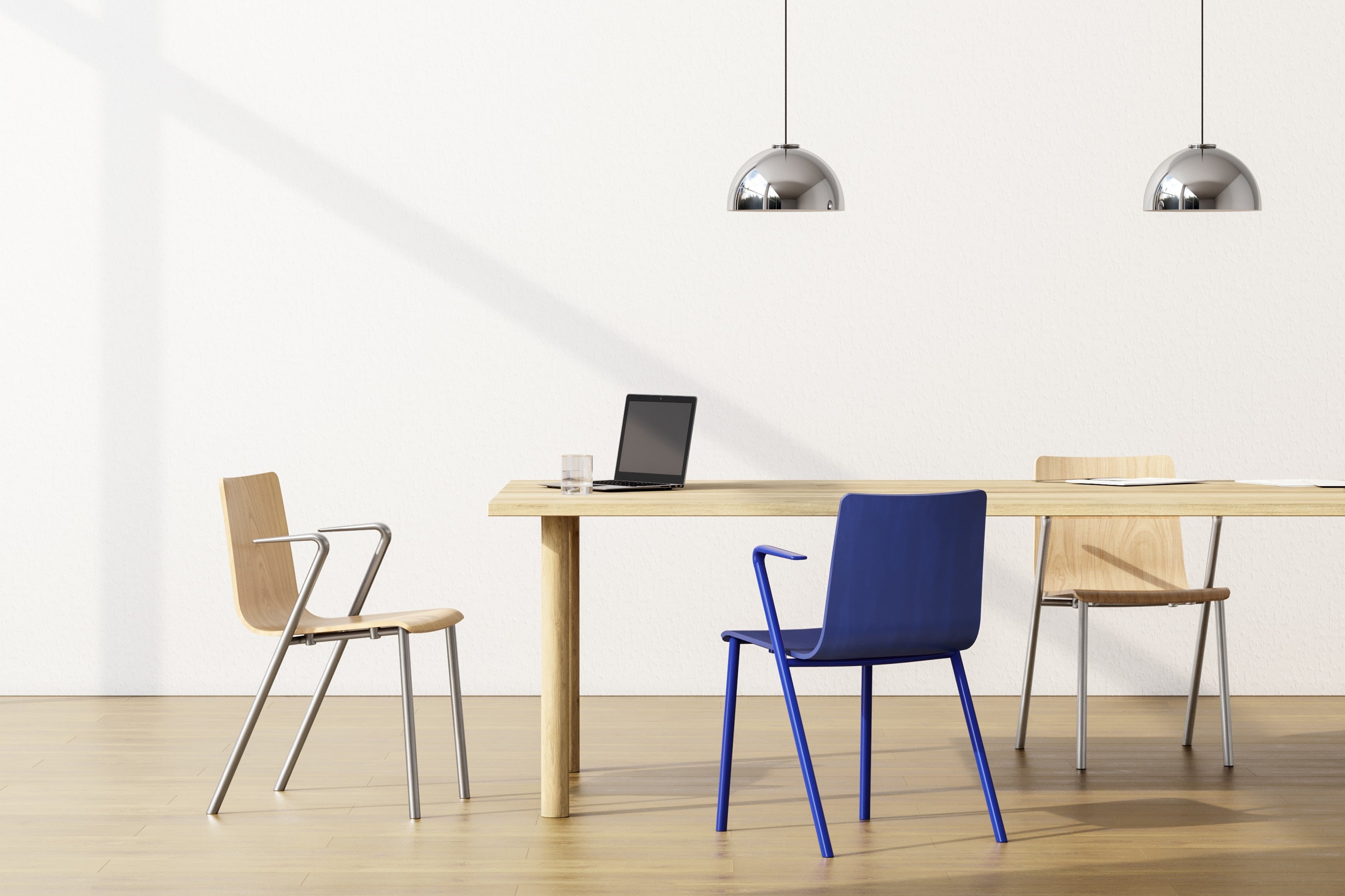 HAKUSANは、アルミダイキャストとスチールのフレームと1枚の合板シェルで作られた、個性と普遍性を兼ね備えたチェアです。フレームとアームレストが一体化した伸びやかなシルエットは、軽やかさと構造の強さを同時に表現し、静かでありながら確かな存在感を空間にもたらします。一般的なスタッキングチェアよりも太径のスチールパイプを採用することで、軽快さを保ちながらも、ダイニングチェアのような落ち着いた安定感を併せ持つ外観を実現しています。素材のコントラストとバランスの取れたプロポーションは、空間に自然と溶け込みながらも、さりげない個性を放ちます。