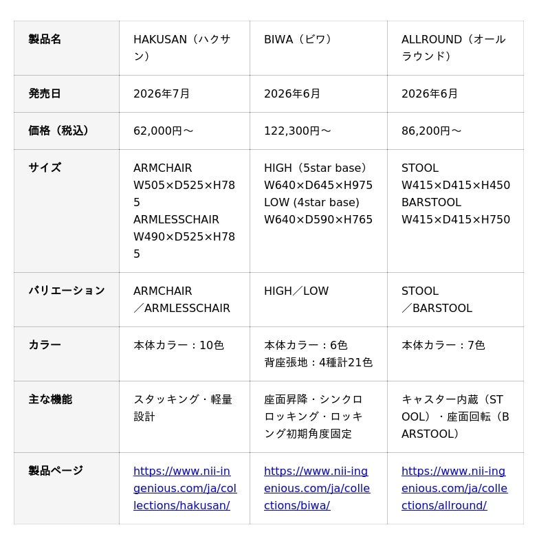 株式会社イトーキ(本社:東京都中央区、代表取締役社長:湊 宏司)が展開するオフィスファニチャーブランド「NII(ニー)」は、2026年6月以降に発売予定の新コレクション「HAKUSAN」「BIWA」「ALLROUND」の3製品を発表します。「HAKUSAN」はロンドンを拠点とするデザインスタジオ Industrial Facility(インダストリアル・ファシリティ)によるデザインです。