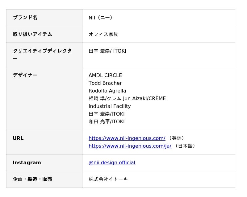 “Ingenious design-創意創発するデザイン”をコンセプトに掲げる「NII」は、オフィスを人が集い、つながり、刺激し合う活気ある舞台へと変えるファニチャーブランドです。国内外のデザイナーとの協業による革新的なコレクションで思考や協働、挑戦を促し、働く人が主役となる新たな価値創造の場を実現します。