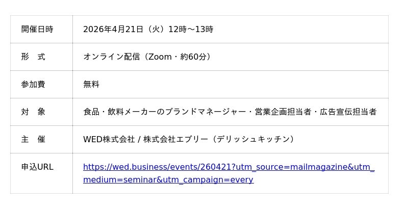 WED株式会社(本社:東京都渋谷区、代表取締役:新井 俊樹)は、株式会社エブリーが運営するレシピ動画メディア『デリッシュキッチン』と共同で、食品・飲料メーカーのマーケティング・営業企画担当者を対象としたウェビナーを2026年4月21日(火)12時より開催します。