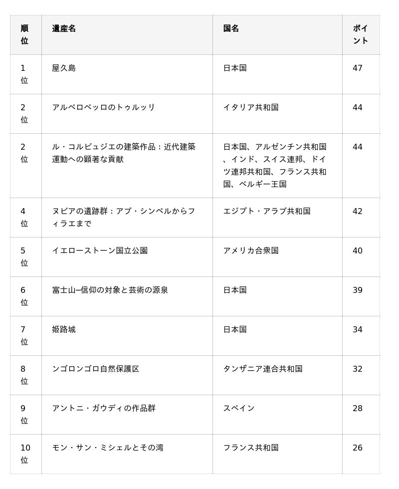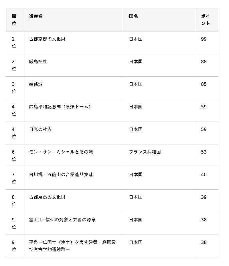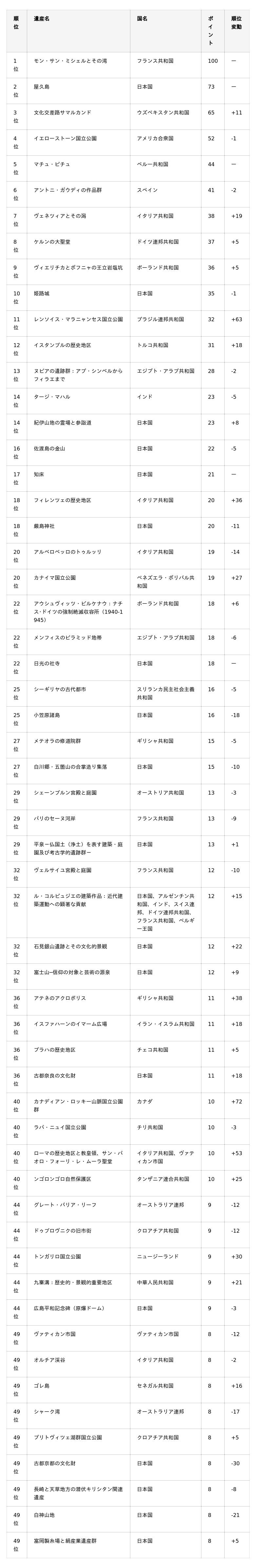 TOP10の顔ぶれを見ると常連が多くランクインしている一方、昨年は10位圏外だった遺産が4つ入っており、順位の入れ替わりが発生しています。過去2年間不動だったTOP3にも変化が生じていますので、注目してみてください。
