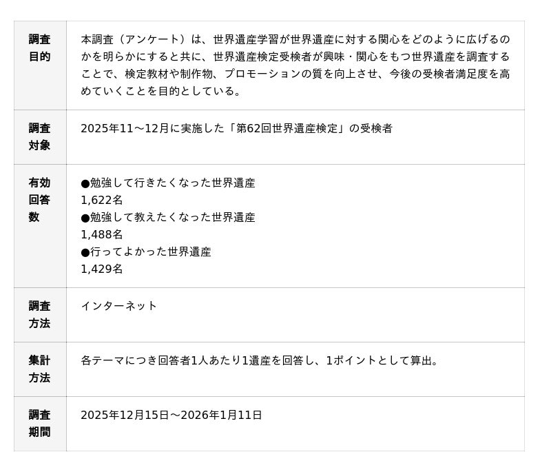 世界遺産は勉強すると実際に行ってみたくなるもの。世界遺産検定事務局では、2025年11~12月実施「第62回検定」の受検者を対象に、「勉強して行きたくなった」世界遺産のアンケートを実施しました。受検者は勉強してからどんな世界遺産に行ってみたくなったのでしょうか?例年に続き、今年もその結果をお知らせします!