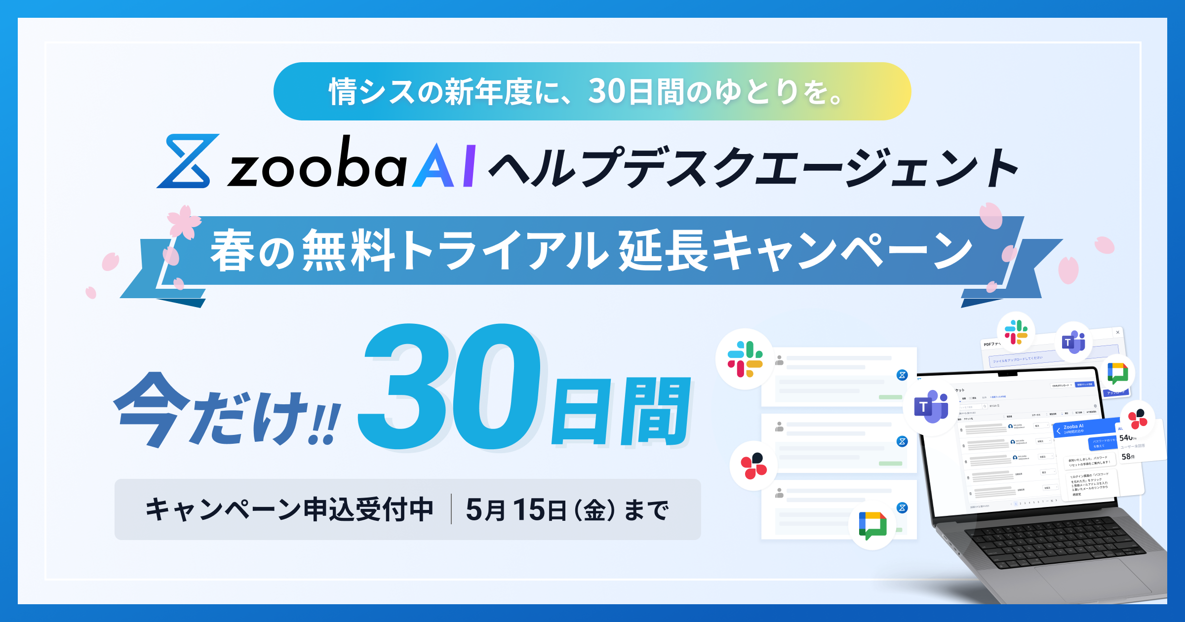 情シス向けAIエージェント「zooba」を提供する株式会社zooba(所在地:東京都立川市、代表取締役:名和 彩音)は、2026年5月15日までの期間限定で、通常14日間の無料トライアルを1ヶ月間(30日間)に延長するキャンペーンを実施いたします。