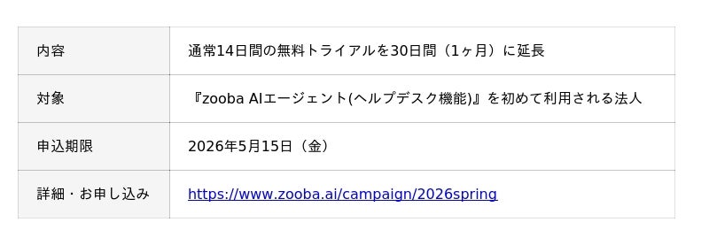 「zooba AIヘルプデスクエージェント」春の無料トライアル延長キャンペーン