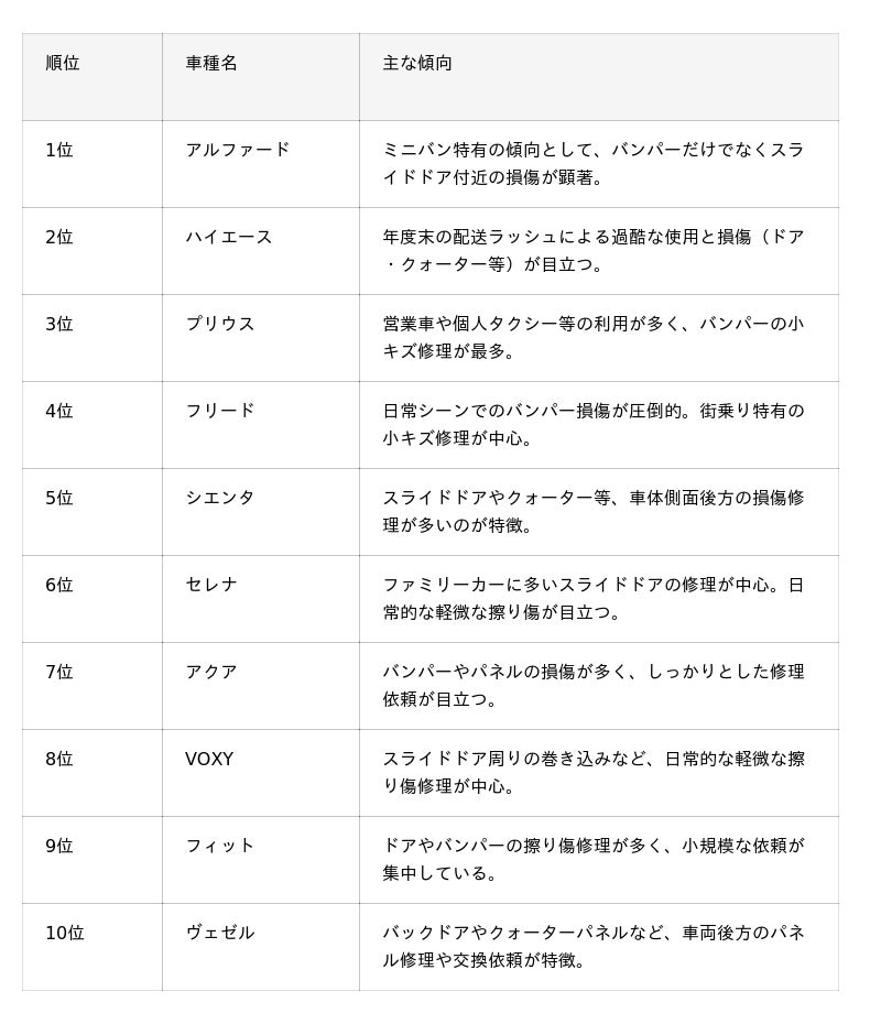 1位「アルファード」、2位「ハイエース」など、ファミリーカーや業務車両の修理需要が上位を占めた。