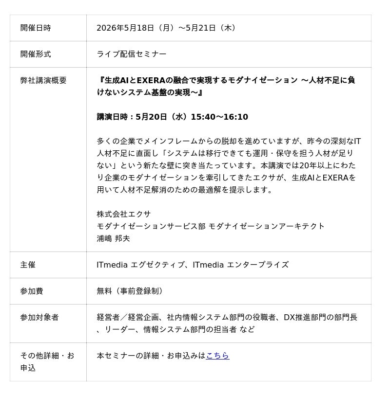 この度エクサは、同イベントの「レガシーモダナイゼーション」(5月20日開催) のセクションで講演を実施する運びとなりました。