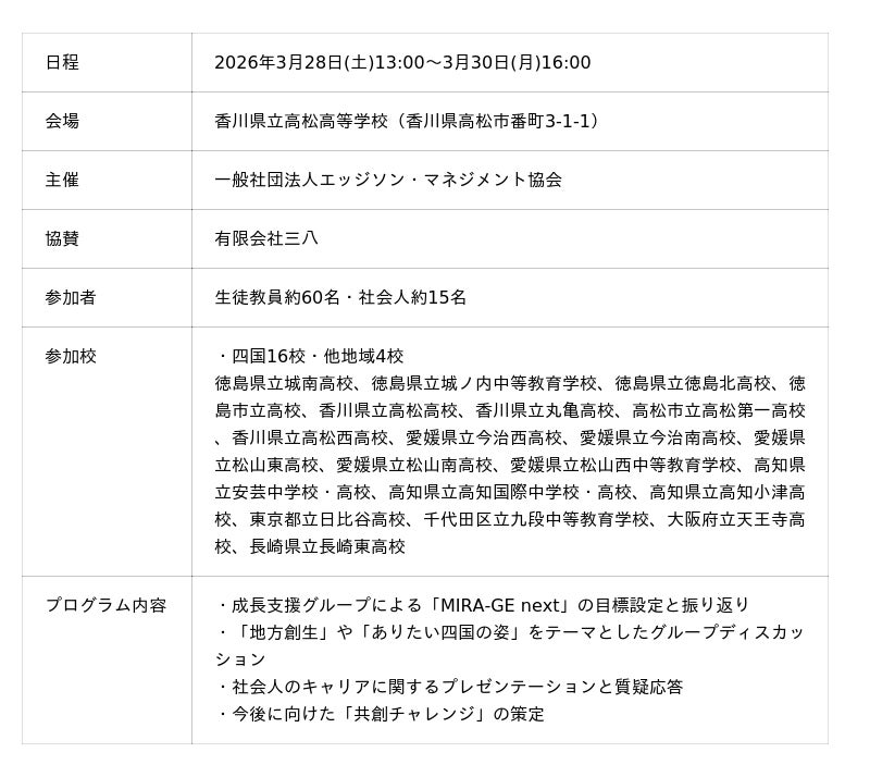 株式会社リンクアンドモチベーション(本社:東京都中央区、代表:小笹芳央、証券コード:2170、以下当社)が設立した一般社団法人エッジソン・マネジメント協会(以下当協会)は、2026年3月28日(土)から3月30日(月)にかけて、香川県立高松高等学校にて、次世代共創リーダー育成を目的とした多世代・多地域型の合宿プログラム「MIRA-GE next(ミラッジネクスト)」を開催いたしました。