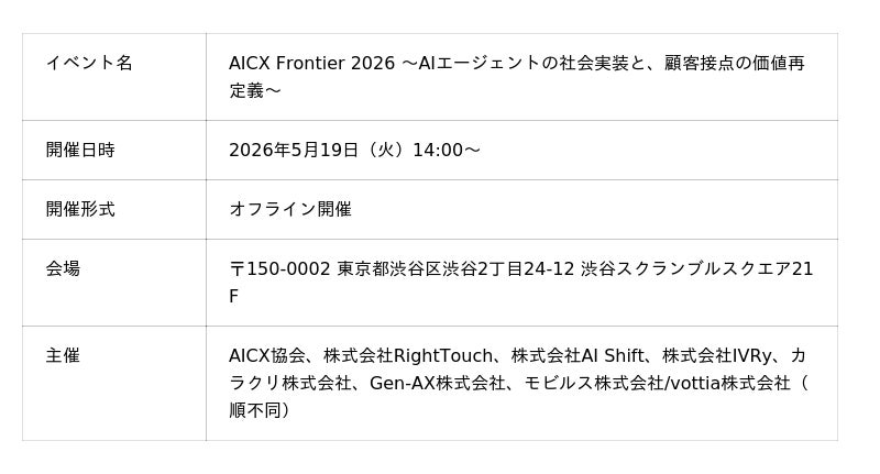エンタープライズ向けにAIコンタクトセンター基盤を提供する株式会社RightTouch(本社:東京都品川区、代表取締役:野村 修平/長崎 大都、以下、RightTouch)は、2026年5月19日(火)14:00~に渋谷スクランブルスクエアで開催される「AICX Frontier 2026 ~AIエージェントの社会実装と、顧客接点の価値再定義~」にゲスト登壇します。