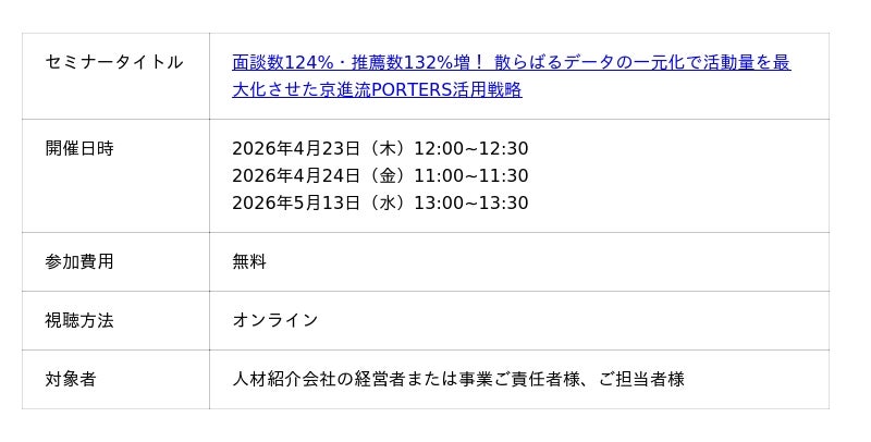 本セミナーでは、外国人材紹介を展開する株式会社京進の国際人材交流事業部にて上席課長を務められている亀谷博之氏がご登壇。かつては情報が点在し現場での入力ルール等に課題を抱えていた同社が、面談数124%・推薦数132%(前年比)という大幅な成果向上を実現した背景と、PORTERSの活用事例についてご紹介いただきます。いかにしてデータを集約し、現場が迷わず動ける環境を構築したのか。「マッチングの時間」を創出し、生産性を劇的に高めた業務改善の実例をお話しいただきます。