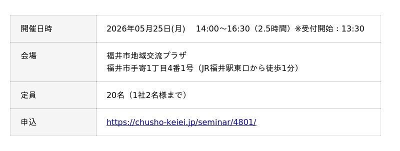 経営革新や、補助金の活用、事業承継コンサルティングに強みがある、株式会社新経営サービス(本社:京都府京都市、代表取締役社長:森谷克也)は、会場参加型セミナー「過去1400名以上の企業リーダーを輩出 & 事業承継の現場からわかった これからの強い後継経営者・経営幹部の育て方と心得」を、2026年5月25日(月)福井の福井市地域交流プラザ(福井市)にて開催いたします。