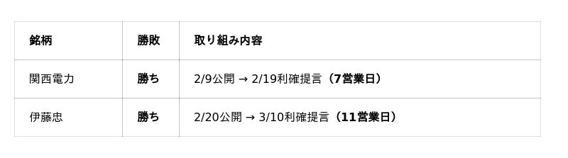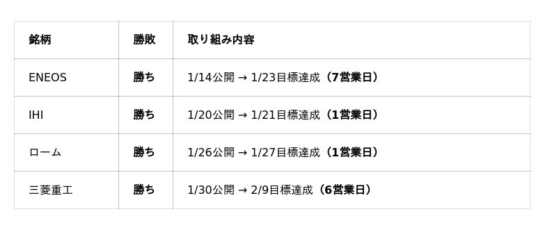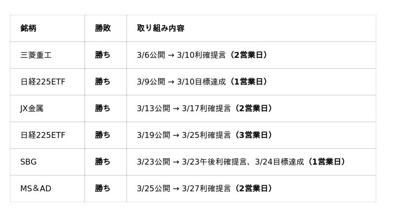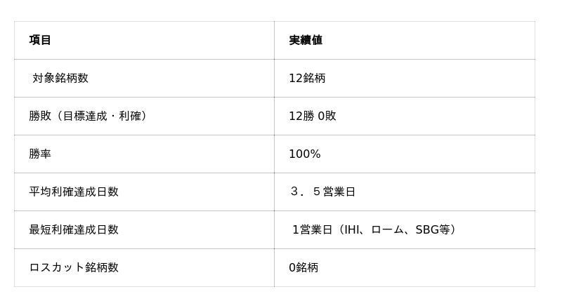 期間中に推奨された12銘柄の実績は以下の通りです。推奨から利確提言(または目標達成)までの平均営業日数はわずか3.5日と、極めて資金効率の高いトレードを実現しています。