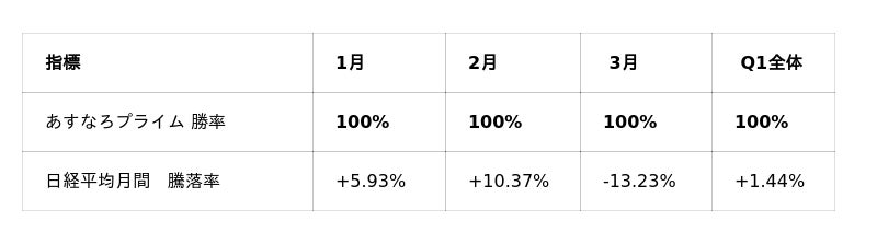 特に3月は日経平均が月間13.23%下落するショック相場となりましたが、あすなろプライム会員の推奨銘柄は全6銘柄が勝利。Q1全体でも日経平均の騰落率+1.44%に対し、全銘柄で利益確定を実現しました。