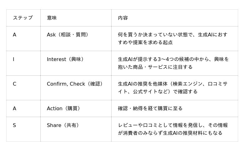 従来の「AIDMA」「AISAS」が Attention(注目) を起点としていたのに対し、「AICAS」は Ask(相談・質問) を起点とする点に特徴があります。消費者は、情報過多の環境下で選択肢が多すぎて「選べない」というストレスを抱える中、生成AIに「おすすめを教えて」と相談・質問を投げかけるところから購買行動をスタートさせるようになりました。