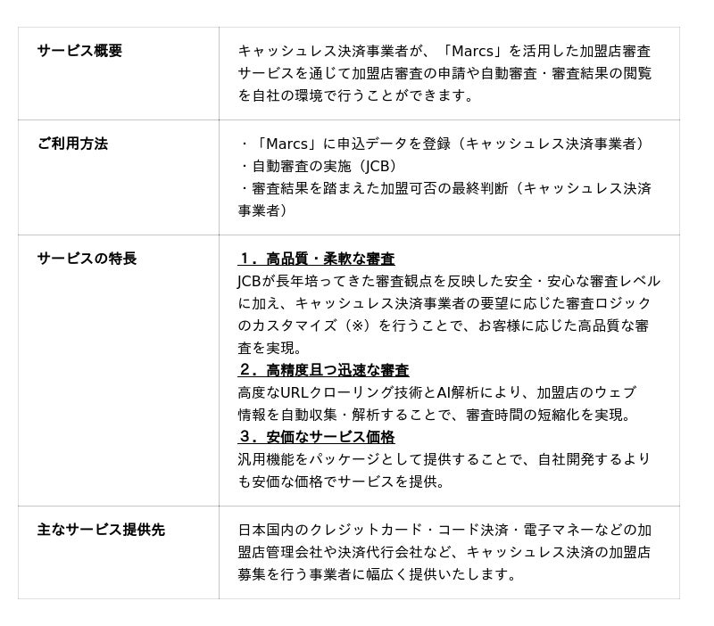 JCB、キャッシュレス決済事業者向けに、「Marcs」を活用した加盟店審査サービスを提供開始