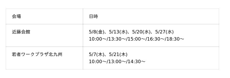 - 募集人数18名- 受講料無料 ※テキスト代5000円の自己負担有- 対象者概ね40歳までの若年者・就職氷河期世代の求職者の方(※1)- 会場近藤会館:福岡県北九州市小倉北区船場町2-10 近藤会館3階 アドバンスクール小倉校小倉駅から徒歩7分、平和通り駅から徒歩2分MAP: