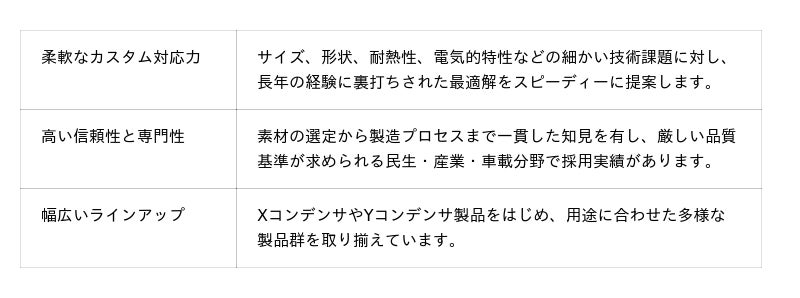 当社は、1951年の設立からフィルムコンデンサの専門メーカーとして半世紀以上のノウハウを蓄積してきたタイツウ社と提携しました。同社との協業により、特定用途に最適化された高品質なコンデンサソリューションを国内外の幅広いお客様へ提供してまいります。