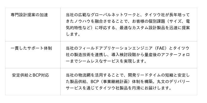 当社は、民生・産業・車載・航空宇宙・医療機器など、幅広い分野に向けてタイツウ社製品の提案を強化してまいります。これにより、お客様の製品価値の向上やトータルコストの低減などに寄与し、産業界の持続的な発展に貢献することを目指します。