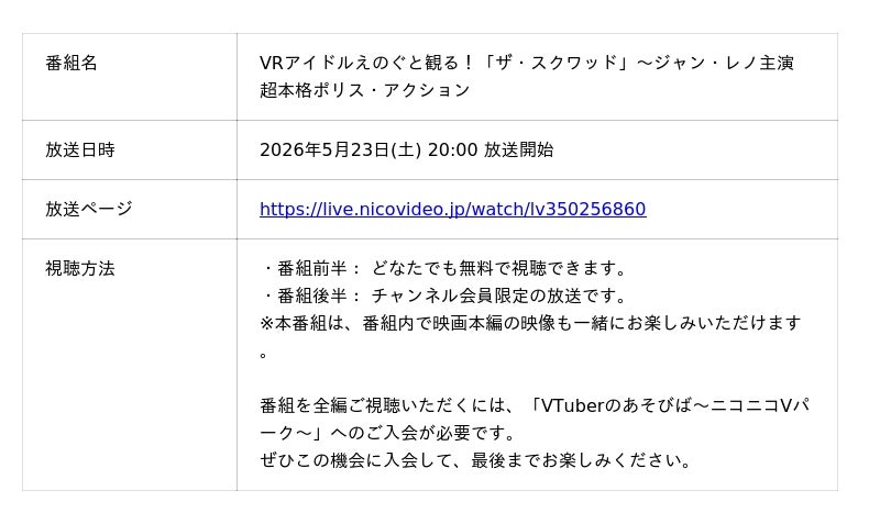 株式会社ドワンゴは、ニコニコチャンネル「VTuberのあそびば~ニコニコVパーク~」にて、2026年5月23日(土)20時より、VRアイドル「えのぐ」のメンバーと一緒に映画『ザ・スクワッド』を観賞する生放送を実施いたします。