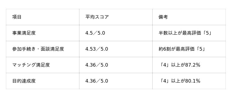 事業全体の満足度は平均4.5/5.0で、半数以上が最高評価の「5」と回答。参加手続き・面談の満足度も平均4.53/5.0で、約6割が最高評価の「5」と回答しています。マッチングの満足度は平均4.36/5.0、「4」以上の回答が87.2%を占めました。訪問目的の達成度についても平均4.36/5.0、「4」以上が80.1%と、いずれの項目でも高い評価を得ています。