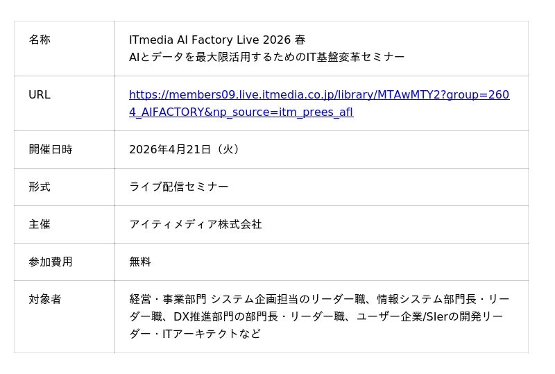 アイティメディア株式会社(本社:東京都千代田区、代表取締役社長 兼 CEO:小林教至、以下アイティメディア)は、2026年4月21日(火)にオンラインセミナー「ITmedia AI Factory Live 2026 春」を開催します。AIがビジネスのエンジンとなる今、鍵を握るのは「自社に最適化された独自のAI」と「AIを育てるデータ基盤」の統合です。本セミナーでは、ライオンやNVIDIAといった先駆的な企業の事例を通じて、企業が独自のAI環境を構築してビジネス価値を創出するための実践的なロードマップを提示します。