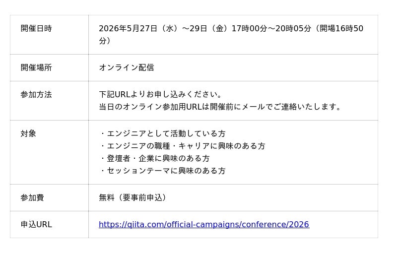 創造性と技術力で多様なITサービスを展開する株式会社エイチームホールディングスのグループ会社で、エンジニアに関する知識を記録・共有するためのサービス「Qiita(キータ)」を展開しているQiita株式会社(本社:名古屋市中村区、代表取締役社長:柴田健介)は、日本最大級のエンジニアコミュニティ「Qiita(キータ)」において、2026年5月27日(水)~5月29日(金)にQiita最大規模のエンジニア向けテックカンファレンス「Qiita Conference 2026(キータ カンファレンス 2026)」を開催します(オンライン配信/視聴無料)。4月15日(水)よりイベントページの公開、参加申込受付を開始いたしました。
