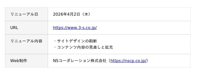 日本管財ホールディングス株式会社(本社:東京都中央区、代表取締役社長:福田慎太郎、以下「当社」)は、当社のグループ会社で、保安警備事業を行う株式会社スリーエスが、2026年4月2日(木)にコーポレートサイトを全面リニューアルしたことをお知らせいたします。