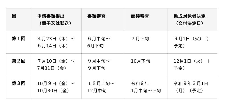 - 申請書類の提出は原則として国(デジタル庁)が提供する「Jグランツ」での電子申請となります。通信回線の故障、災害、その他の理由によりJグランツのご利用が困難で、やむなく郵送申請を希望される場合は、以下の事業WEBサイトをご確認ください。なお、持参、FAX及び電子メールによる提出はお受けできません。また、申請受付は、各回とも申請書類提出最終日の17時必着です。- 募集要項・申請書様式等は、以下事業WEBサイト内の「申請手続き」のページに掲載します。- URL: