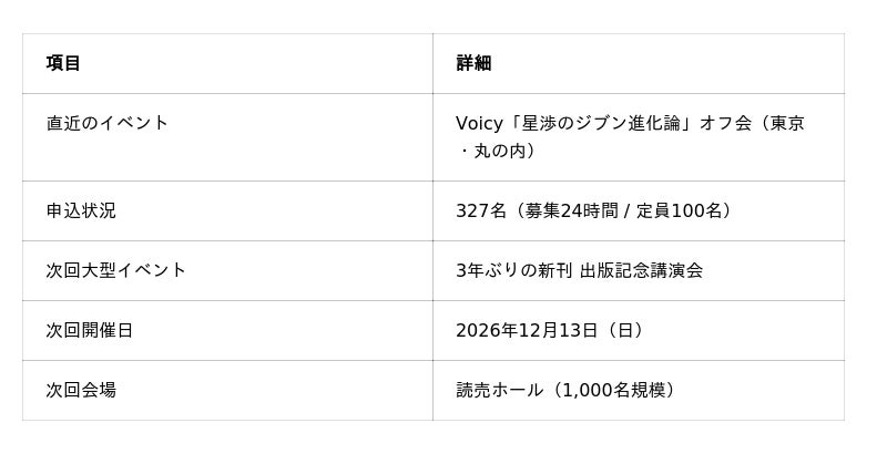 株式会社Rising Star(代表取締役:星渉)は、2026年4月、日本最大級の音声配信プラットフォームVoicyの人気番組「星渉のジブン進化論」のリスナーを対象としたオフ会を、東京・丸の内にて開催いたしました。100名限定の枠に対し、募集開始からわずか24時間で327名の申し込みが殺到。当日は、2026年秋に発売予定となっている3年ぶりの新刊の内容が、参加者限定で一部先行公開されました。また、新刊の発売を記念し、2026年12月13日(日)に東京・有楽町の読売ホールにて1,000人規模の講演会を開催することを発表いたしました。