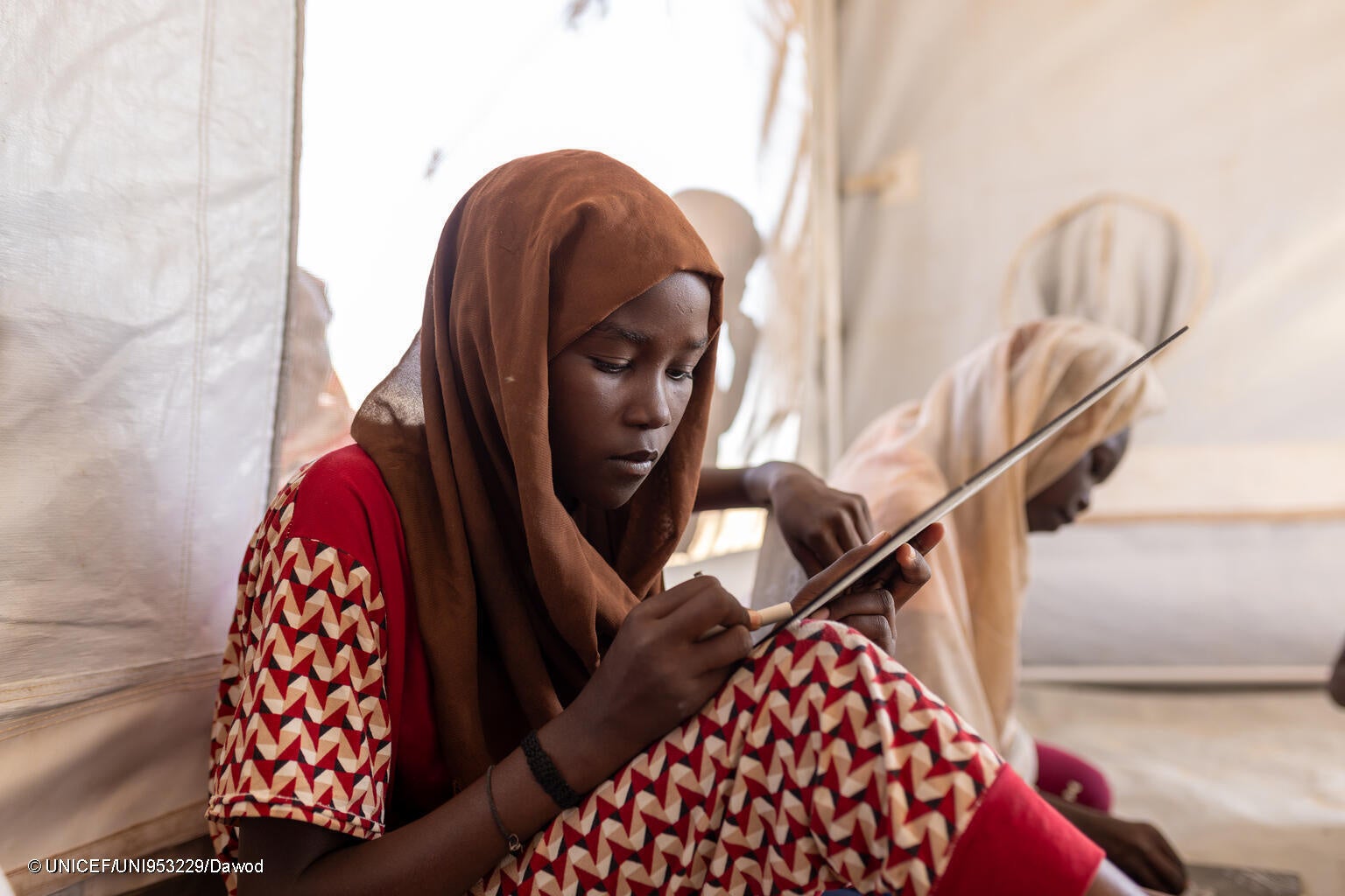 白ナイル州の避難民キャンプで、ユニセフが支援する「子どもにやさしい空間」で絵を描く13歳のヌーハさん。コルドファンから逃れてきたが、混乱の中で家族と離れ離れになり、現在もその行方は分かっていない(スーダン、2026年2月15日撮影) (C) UNICEF/UNI953229/Dawod