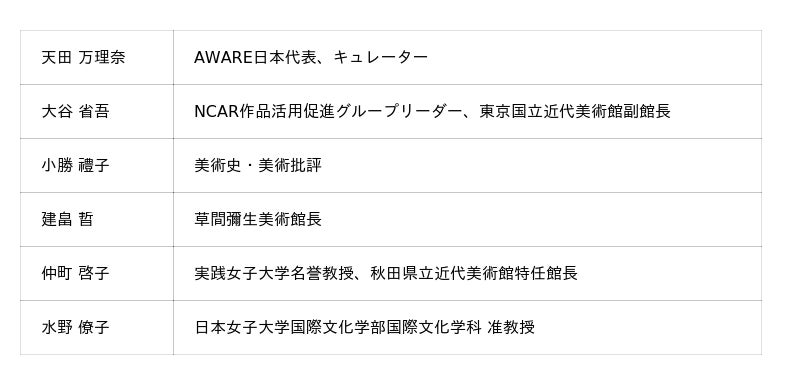 本フェローシップを通じてNCARとAWAREは、日本における女性アーティスト研究のさらなる活性化を図るとともに、国際的な研究基盤の形成および文化的多様性の推進に寄与してまいります。