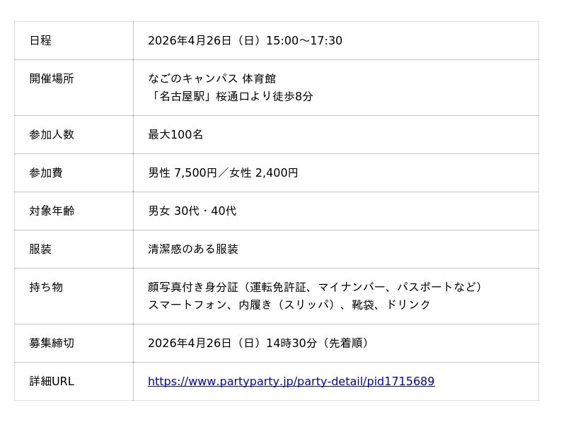 国内最多*¹の成婚数を誇る株式会社IBJ(代表取締役社長:土谷 健次郎、本社:東京都新宿区、東証プライム:6071、以下「IBJ」)が運営する婚活パーティーサービス「IBJ Matching」は、2026年4月26日(日)、名古屋の学校跡地を活用した施設「なごのキャンパス」にて、最大100名規模の婚活イベント「良縁大作戦」を開催します。本イベントでは、全参加者と1対1で会話を繋ぐ“回転寿司形式”のシステムを導入。短時間で多くの方と対面したいという「タイパ(タイムパフォーマンス)重視」のニーズに応え、効率的かつ確実な“リアルの出会い”を提供します。