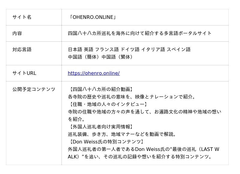株式会社伸和エージェンシー(大阪市、代表取締役社長:大仁 公一)、株式会社こころ旅行社(愛媛県上浮穴郡久万高原町、代表取締役:鈴村 嘉右)、株式会社こんにちハロー(東京都中央区、代表取締役CEO: 早見 星吾)の3社で構成する「お遍路の魅力を世界に発信プロジェクト委員会」は、外国人向けお遍路情報ポータルサイト「OHENRO.ONLINE」を4月15日に公開しました。本サイトでは、四国八十八カ所巡礼を検討している海外の旅行者や巡礼経験者に向けて、お遍路文化の魅力や精神性について動画で発信します。