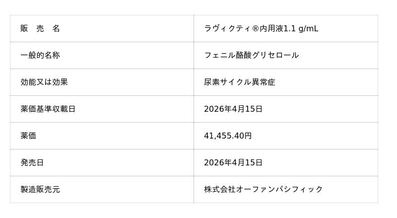 株式会社オーファンパシフィック(本社:東京都港区、代表取締役社長:原 愛、以下「オーファンパシフィック」)は、尿素サイクル異常症(Urea Cycle Disorder、以下UCD)を効能又は効果とする「ラヴィクティ(R)内用液1.1 g/mL」(一般名:フェニル酪酸グリセロール、以下「ラヴィクティ(R)」)について、本日、薬価基準に収載され、販売を開始したことをお知らせいたします。