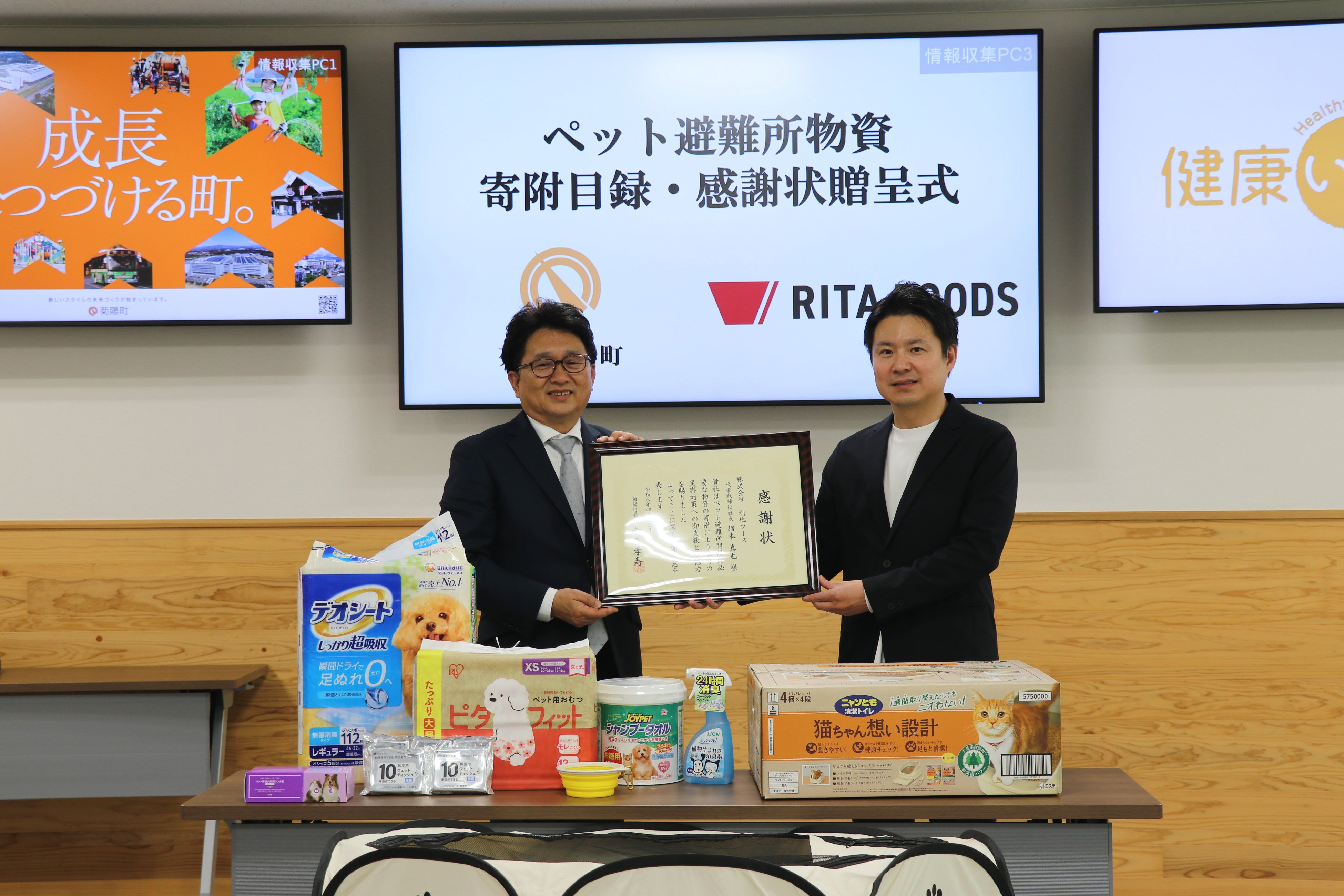 その後、町防災課との対話を通じて、避難場所の指定(ハード面)が進む一方で、実際に受け入れるために必要なサークルや消耗品(おむつ、シート、衛生用品等)といった「ソフト面の備え」が急務であるという実情を把握いたしました。「場所はあっても、受け入れるための物資が整っていない」という現場の課題を解決するため、『健康いぬ生活』からペット用防災備蓄品を寄付させていただく運びとなりました。