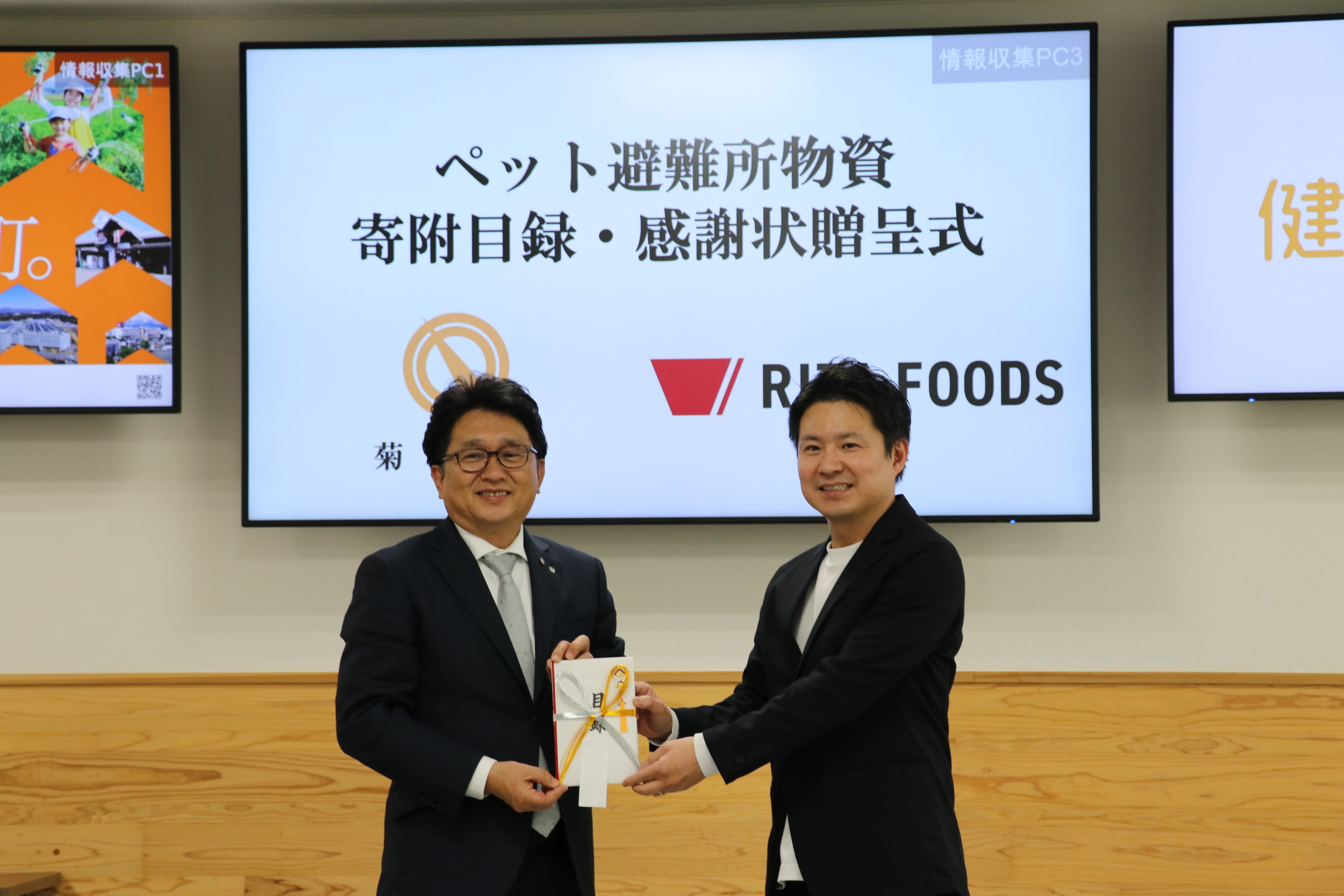 https://kenko-dog.com/ )は、熊本地震の発生から10年となる2026年4月15日、熊本県菊陽町へペット専用の防災備蓄物資を寄付し、同日、贈呈式を実施いたしました。