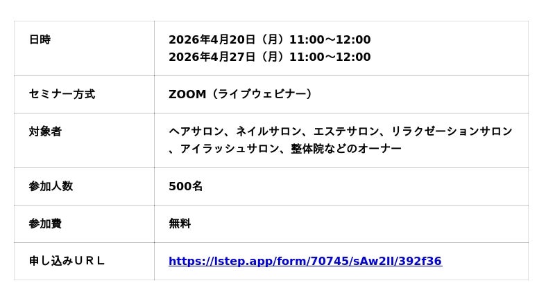 対象: ヘアサロン、ネイルサロン、エステサロン、リラクゼーションサロン、アイラッシュサロン、整体院など