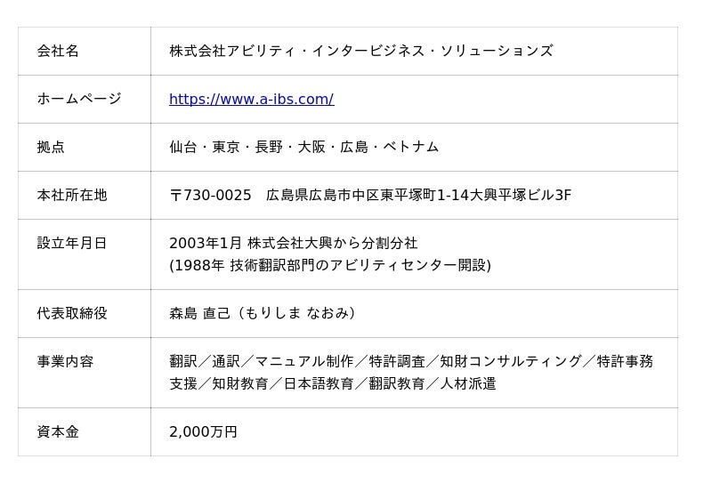株式会社アビリティ・インタービジネス・ソリューションズ(AIBS)は、言語と知財のプロフェッショナルとして、お客様のベストパートナーを目指します。