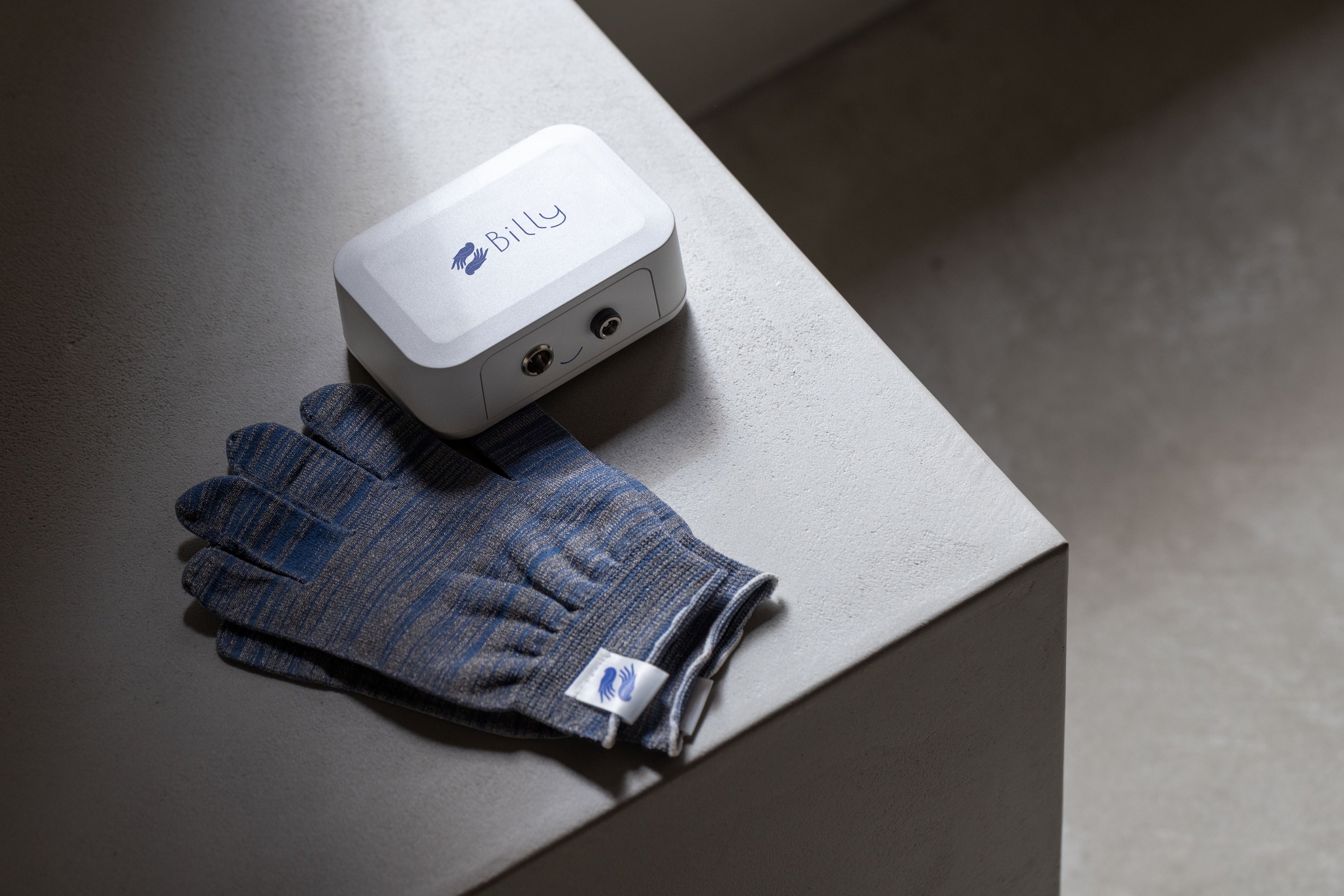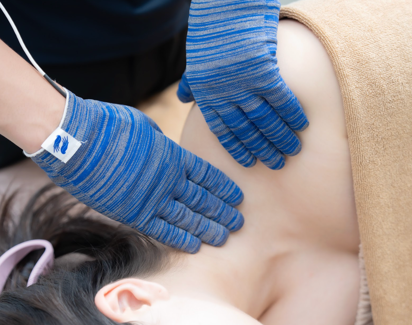 1. 【レッスンの質を劇的に向上】微弱電流による瞬時の可動域拡大特殊なグローブ「BillyHands」を装着したインストラクターがクライアントに触れるだけで、電気の神経反射を利用して深部の筋肉や癒着した筋膜にアプローチします。無理なストレッチや強い指圧を行うことなく、巻き肩の解消や胸椎・股関節の可動域を短時間で拡大。体が整った状態でレッスンに入ることで、ピラティスの効果(インナーマッスルの活性化など)をクライアントが実感しやすくなります。
