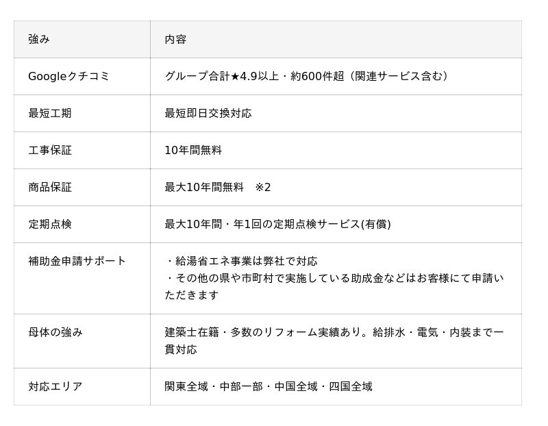 交換パラダイスは、建設・リフォーム会社が運営する住宅設備交換サービスであり、「問い合わせ → 見積 → 工事 → 補助金申請 → アフター」まで一貫対応できる点が特徴です。