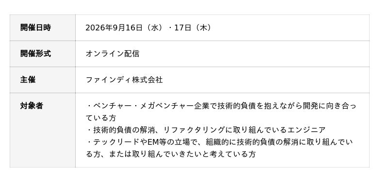 エンジニアプラットフォームを提供するファインディ株式会社(東京都品川区、代表取締役:山田 裕一朗、以下「当社」)は、2026年9月16日(水)・9月17日(木)の2日間、オンラインで「技術的負債に向き合うConference 2026」を開催することを発表します。本カンファレンスは、技術的負債に取り組むベストプラクティスや事例を共有するものです。現在、本カンファレンスのスポンサーを募集しております。