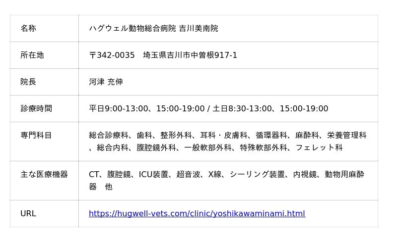 株式会社ハグウェル(本社:埼玉県本庄市 代表取締役:土屋 裕雅)は、2026年5月11日、埼玉県吉川市に、「ハグウェル動物総合病院 吉川美南院」をオープンいたします。吉川美南院は、ハグウェルが横浜鶴ヶ峰院に次いで展開する2院目の拠点です。また本院は、ハグウェルと同じベイシアグループのホームセンター「カインズ 吉川美南店」の敷地内への出店となります。日常の買い物動線と動物医療が自然につながる環境を整え、生活圏の中で継続的に利用できる新しい医療環境の実現を目指します。