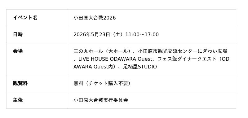 「小田原大合戦」は、地元小田原の高校生が主体となって企画・運営するサーキット型音楽フェスです。今年で5回目を迎え、これまで延べ約6,500人以上の来場者を動員。小田原駅周辺の5つの会場(ライブハウス・ホール・スタジオ)を同時に使用するサーキット型フェスとして開催され、入場は完全無料です。「音楽で小田原を盛り上げたい」という高校生たちの熱意が、地域全体を巻き込む一大イベントへと成長しています。