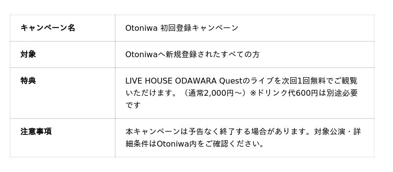 本キャンペーンは、Otoniwaとライブシーンをより多くの方に体験していただくための取り組みです。「まずは一度、ライブハウスへ」--そのきっかけをつくることで、小田原の音楽文化のさらなる活性化を目指します。