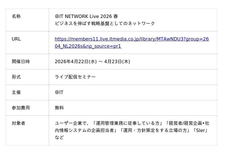 アイティメディア株式会社(本社:東京都千代田区、代表取締役社長 兼 CEO:小林教至、以下アイティメディア)は、2026年4月22日(水)~ 4月23日(木)に「@IT NETWORK Live 2026 春」を開催します。本イベントは「@IT」が主催するライブ配信セミナーで、自社ネットワークの設計・運用をアップデートしたい方向けに、さまざまな事例や実践的な情報を提供します。