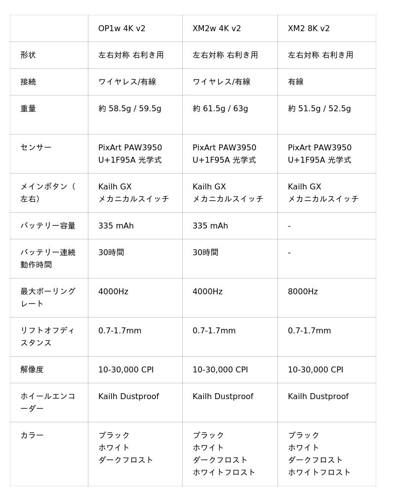 OP1w 4K v2ワイヤレス・4000Hzポーリングレート対応のゲーミングマウス「OP1w 4K」のセカンドバージョン。最大4000Hz対応のUSBドングルを標準装備。335 mAhのバッテリーを搭載し、30時間の連続動作が可能。メインボタンのスイッチを簡単に変更できるホットスワップ機構に対応し、様々な交換スイッチ(オプション品)にカスタムできる。カラーは3色展開。