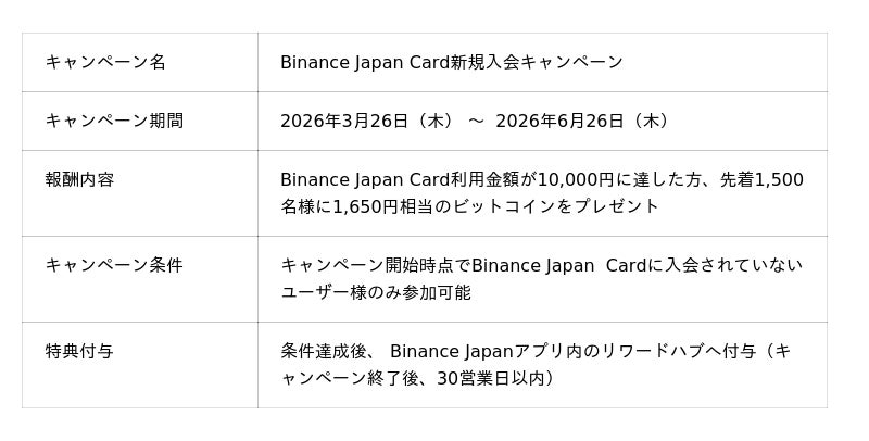 本キャンペーンでは、期間中にBinance Japan Cardに新規お申し込みいただき、合計10,000円以上ご利用いただいた先着1,500名様に、1,650円相当のビットコイン(BTC)をプレゼントいたします。これにより、クレジットカード2年目以降の年会費(税込1,650円)が実質無料となります。