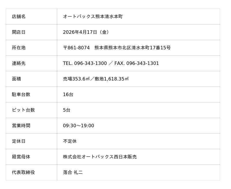 オートバックスセブン(代表取締役 社長:堀井勇吾)と加盟店契約を結んでいる株式会社オートバックス西日本販売(代表取締役:落合 礼二)は、2026年4月17日(金)に「オートバックス熊本清水本町(くまもとしみずほんまち)」を新規オープンいたします。