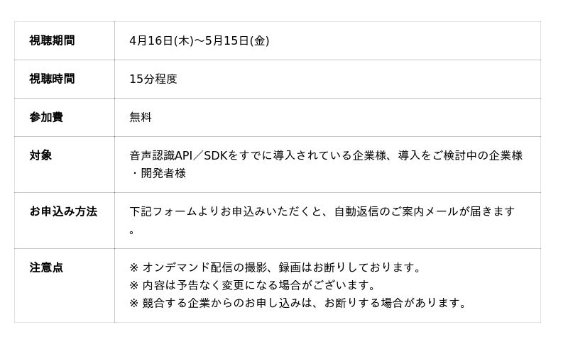 株式会社アドバンスト・メディア(本社:東京都豊島区、代表取締役会長兼社長:鈴木清幸 以下、アドバンスト・メディア)は、「ノーコード/ローコードプラットフォームでAmiVoice(R)を使ってみよう ~Claris FileMaker編~」のオンデマンド配信を開始いたします。